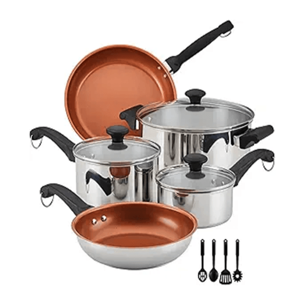1-quart saucepan with lid, 2-quart saucepan with lid, 5-quart Dutch oven with lid, 8.5-inch ceramic frying pan, 10.25-inch ceramic frying pan, slotted turner, slotted spoon, solid spoon, pasta fork