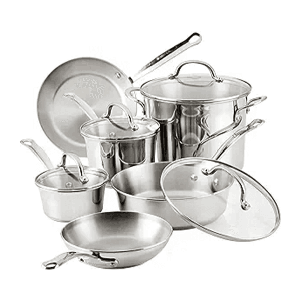1-quart and 2-quart saucepans with lids, 8-quart stockpot with lid, 8-inch and 10-inch frying pans, and a 3-quart saute pan with lid